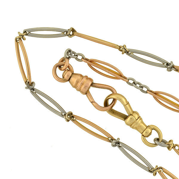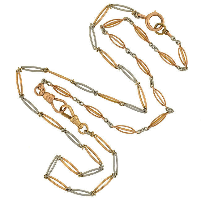 An exquisite chain necklace from the Edwardian (ca1910) era! This marvelous piece is comprised of 2 unique but complimentary watch chains which come together to form a single 24.5 chain. The chain is comprised of open ellipse-shaped wirework links, which alternate between platinum and rose gold and the individual chains connect to each other at a large rose gold spring ring clasp as well as two 14kt gold watch swivel clasps. The clasps allow the wearer to easily add a complimentary locket, pendant or fob and could also be worn as a choker on a small neck. A spectacular piece, this?magnificent chain looks striking when worn and would make an excellent addition to any collection!