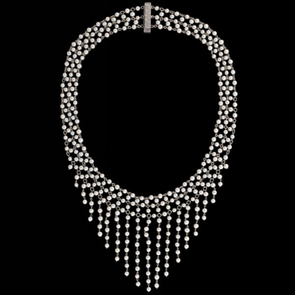 An absolutely stunning platinum and pearl necklace from the Edwardian (1900) era! This lovely and feminine piece is set in platinum and comprised of over a 350 cultured pearl. At the center of the necklace are 19 festoon style links that graduate in length with the longest resting in the center. While each link grows in length, it also increases in the number of pearls which hang from it. The pearls are connected to each other by small platinum links and separated by small rings. The vertically hanging festoon links hang from a lacy mesh-like chain which clasps in the back at a diamond encrusted clasp. Four rows of pearls line the entire length of the chain forming a comfortable necklace that rests beautifully within the collarbone. It has a dramatic design that rests perfectly on the neck. It would make a gorgeous addition to any collection and would be the perfect accessory for a bride on her wedding day or worn for a dressy occasion!