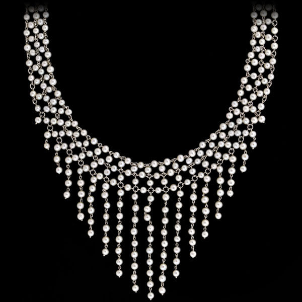 Measurements: The necklace measures approximately 15 in length. The festoon style links graduate in length from 1/4 being the shortest and 2 1/4 being the longest, center link. The pearls vary slightly in size but all measure around 3.25mm.