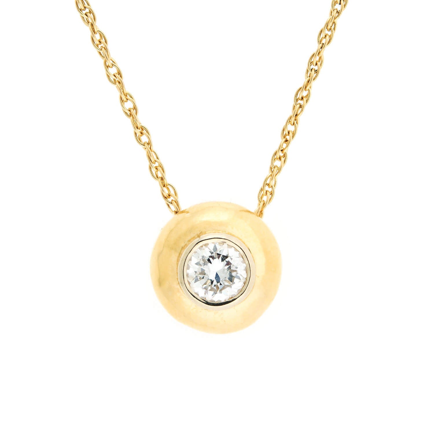 A beautiful and?simple Estate diamond necklace! Crafted in 14k yellow?gold, this lovely piece is comprised of a single round cut diamond bezel set into a gold pendant?treaded through with a?delicate gold rope?chain. The?round brilliant diamond weighs approximately 0.50ct, with?H color and SI1 clarity.?The chain threads through small holes drilled into the gold setting, fastening at the back of the neck with a lobster claw.?The necklace is absolutely gorgeous when worn and the?timeless design would perfectly complement any jewelry collection!
