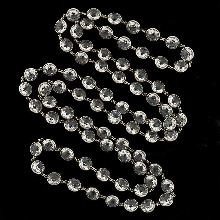 A gorgeous crystal necklace from the late Art Deco (ca1930s-1940s) era! This long, elegant necklace is comprised of large crystals encased in sterling silver bezels. Each found crystal is beautifully faceted, catching the light for a gorgeous sparkling effect! The generous length of the necklace can be easily doubled for a layered look when worn. This classically beautiful design could be worn day or night, and is versatile enough to compliment any jewelry collection!