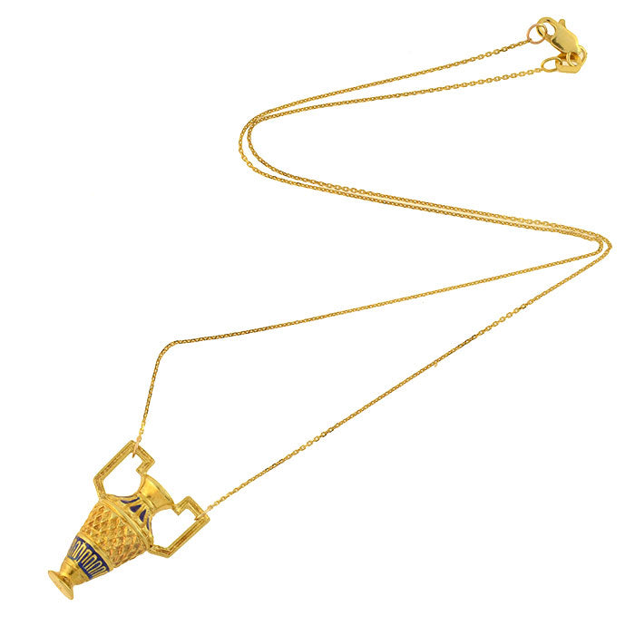 A beautiful enameled?urn?necklace from the Victorian (ca1880) era! This delicate mourning-inspired piece consists of a petite 18kt gold urn charm that hangs from a fine 14kt gold chain. The 3-dimensional urn is covered in textured detail and beautiful enameled accents. Decorative handles emerge from the sides, and the flared neck of the urn reveals a hollow interior. The enameled accents are a deep, rich shade of royal blue, which contrasts beautifully with the vibrant gold setting. The chain attaches to each handle at the side, and fastens with a delicate lobster clasp in the back (stamped 14K). A charming?Victorian piece, this wonderful and sentimental memento would?make a special addition to any collection!