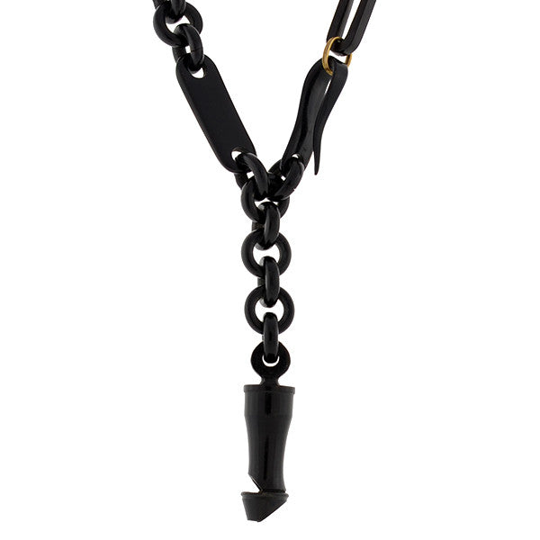 Condition: The overall condition of the necklace is excellent. Besides normal surface wear, there are no large chips or scratches in the jet links. The hook clasp fastens securely and the whistle is intact.