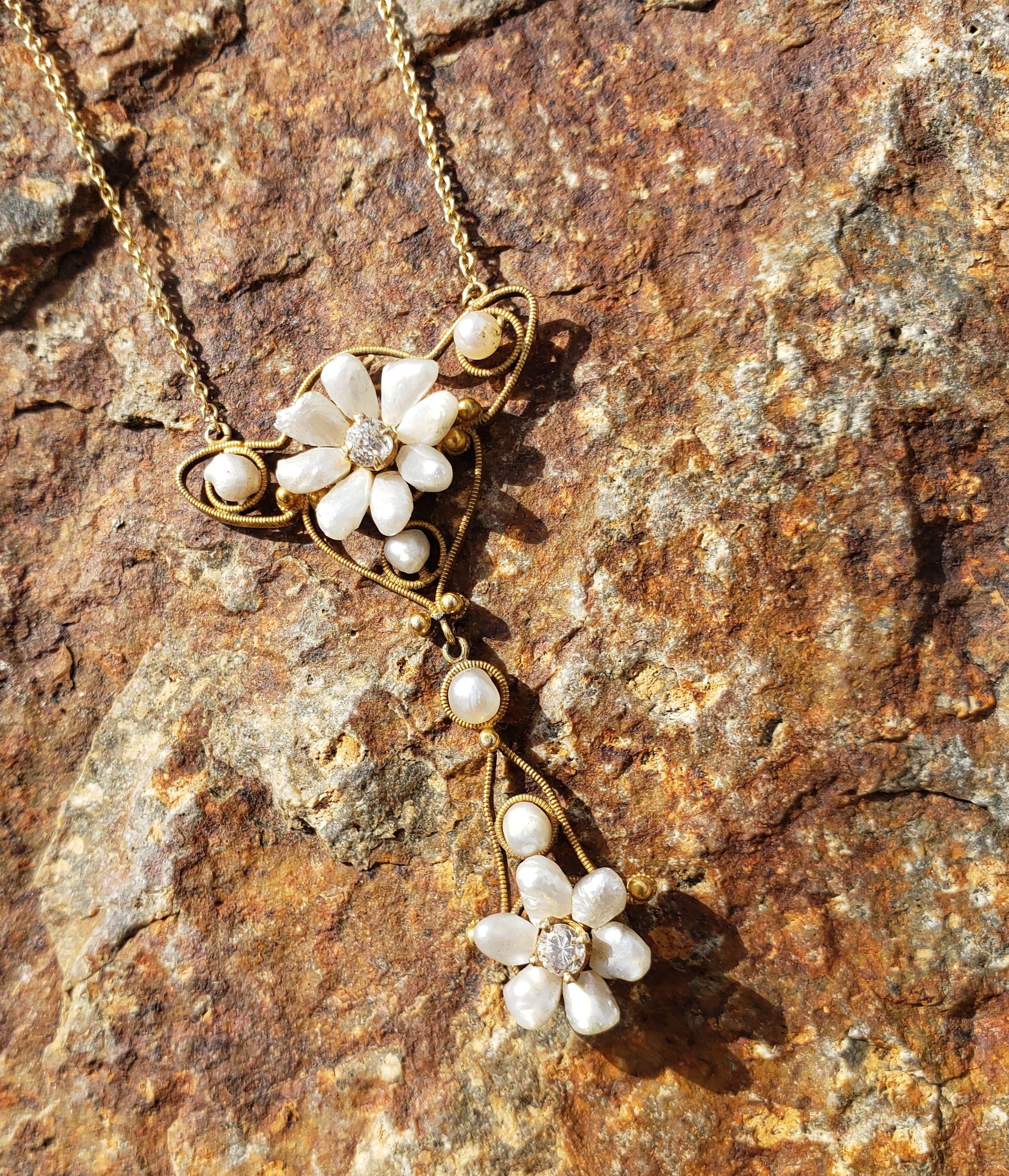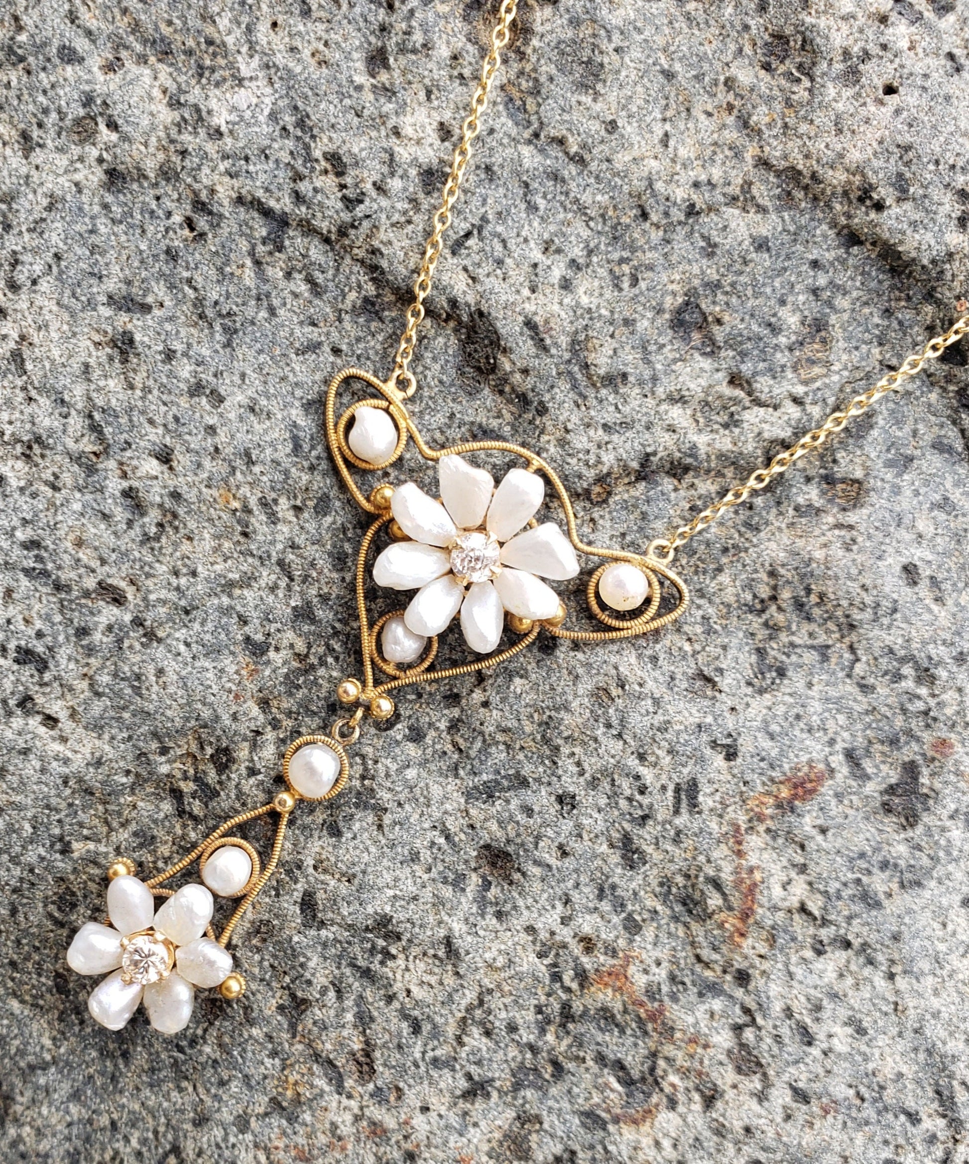 14k gold Victorian natural pearl & diamond flower necklace pendant lavaliere