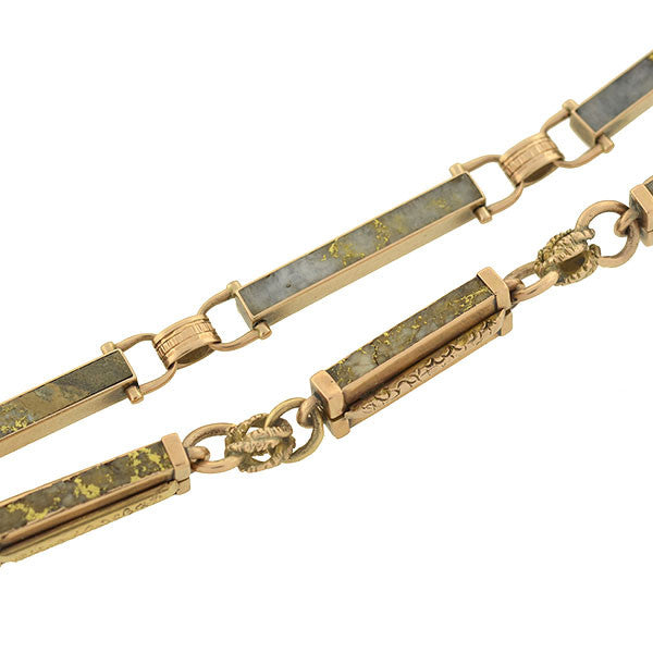 An absolutely fabulous gold quartz and gold watch chain from the Victorian (ca1880) era! This fantastic chain is a handmade piece comprised of what appears to be 2 different gold quartz inlaid watch chains. The chains connect to each other to make a wonderful, longer watch chain which looks perfect worn alone or for displaying a complimentary locket or pendant. Made of rosy 14kt yellow gold, the chain is comprised of wonderfully detailed and ornate links. Each heavy link is inlaid with 2 plaques of gold quartz which is set into each side. The larger, rectangular shaped links attach to each other by ornate gold links that carry an intricate etched design. At the back of the chain is a watch swivel clasp and hanging from the center is a large gold barbell that hangs from 5 small links. A gorgeous necklace, it can be worn alone as a simple chain or with a complimentary pendant or locket.