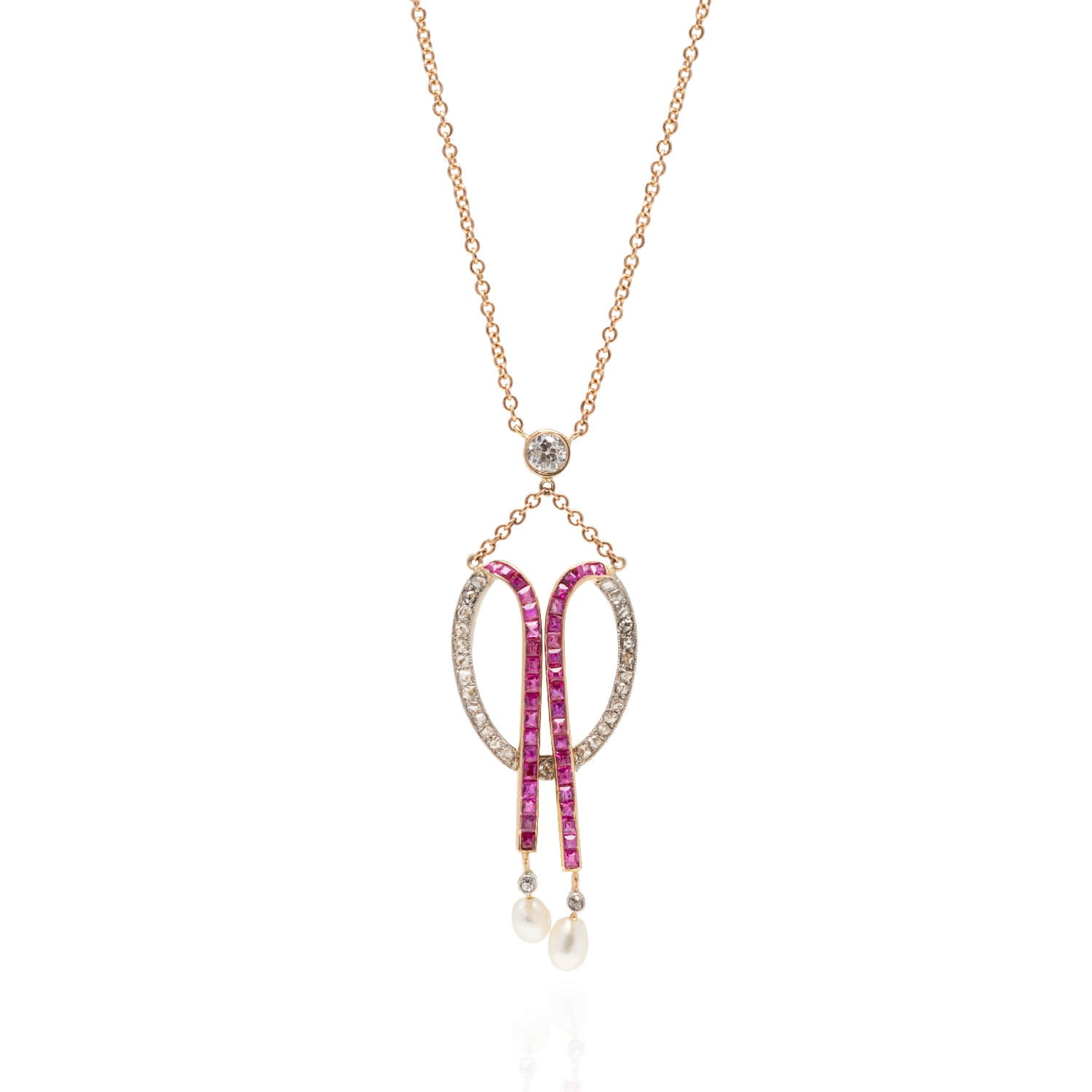 A gorgeous pendant necklace from the Edwardian (ca1910s) era! Crafted in 18kt yellow gold and topped in platinum, this unique pendant has an elegant design of glittering Single Cut diamonds and Square Cut calibrated rubies. The bead-set diamonds, weighing approximately 0.25ctw, and the 0.65ctw of channel-set rubies rest in an elegant looping design, and a bezel-set diamond and lustrous natural pearl?dangle from?each ends. Two fine yellow gold chains carry the pendant, connecting at a sparkling 0.35ctw Old Mine Cut diamond held in an open-backed bezel. Matching chain and a spring ring marked AU750 secure the necklace. This beautiful pendant necklace would be an impressive addition to an Edwardian collection!