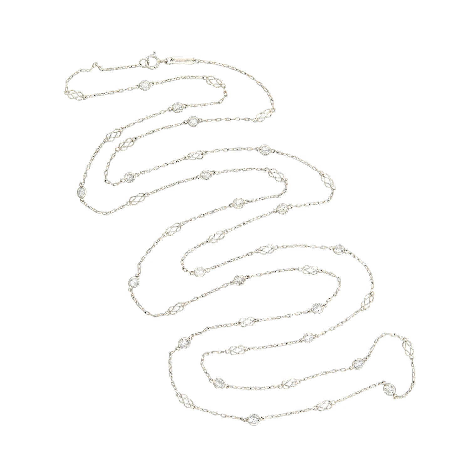 Condition: The overall condition of the necklace is excellent. Besides normal surface wear, there is no apparent damage to the platinum chain. All of the diamonds are intact and securely set. The clasp is secure and in good working condition.