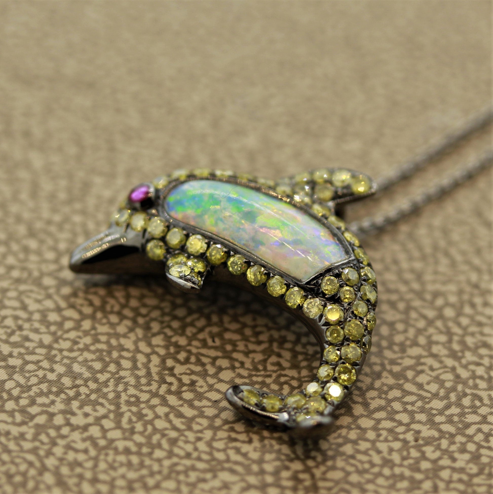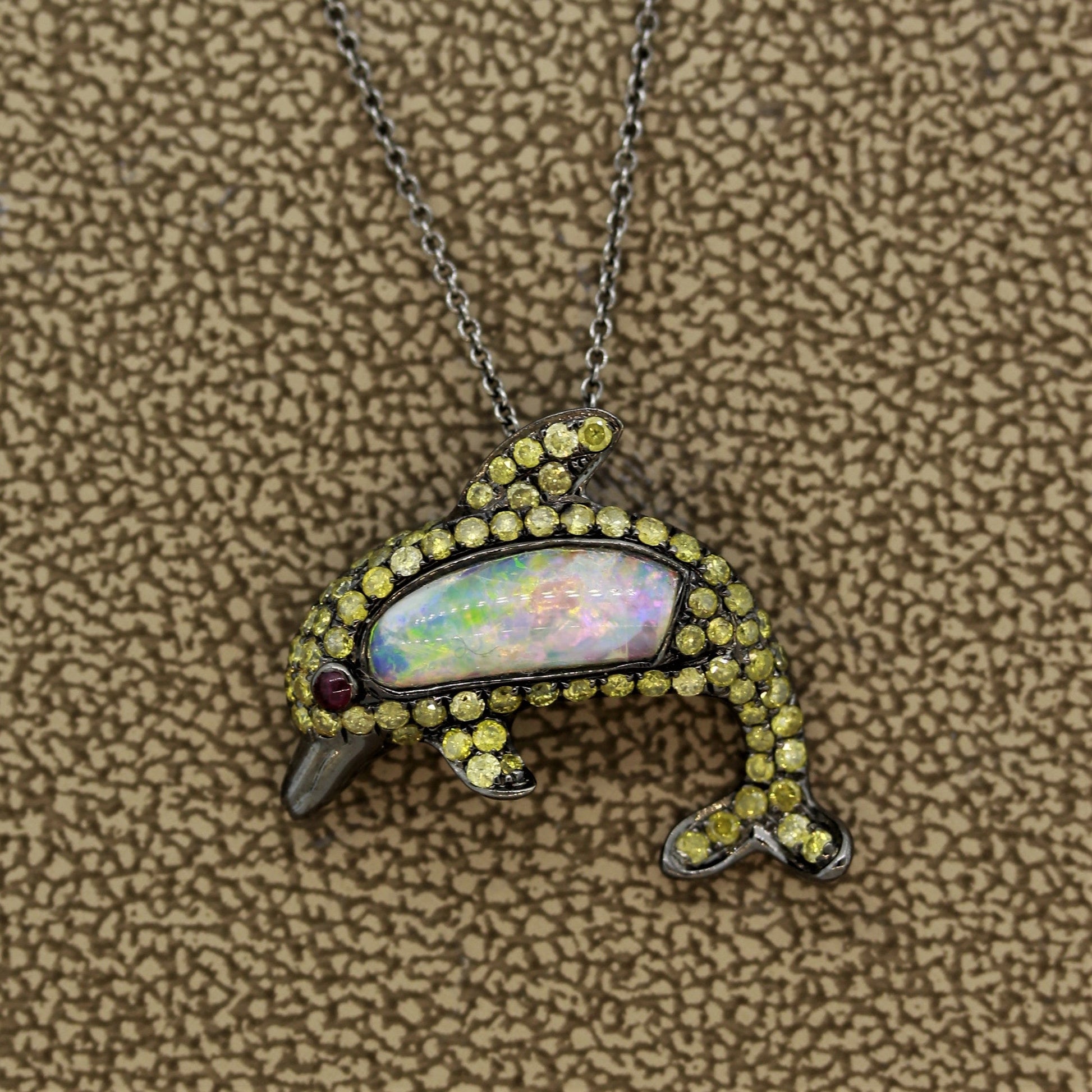 A cute and lifelike dolphin! It features 0.73 carats of fancy yellow diamonds and 1 cabochon ruby eye. Its body is set with a true gem of an opal. It weighs 1.12 carats and has exceptional play of color with bright flashes of red, green, and blue. Made in 18k gold with a rhodium finish to give the piece a smooth metallic look.