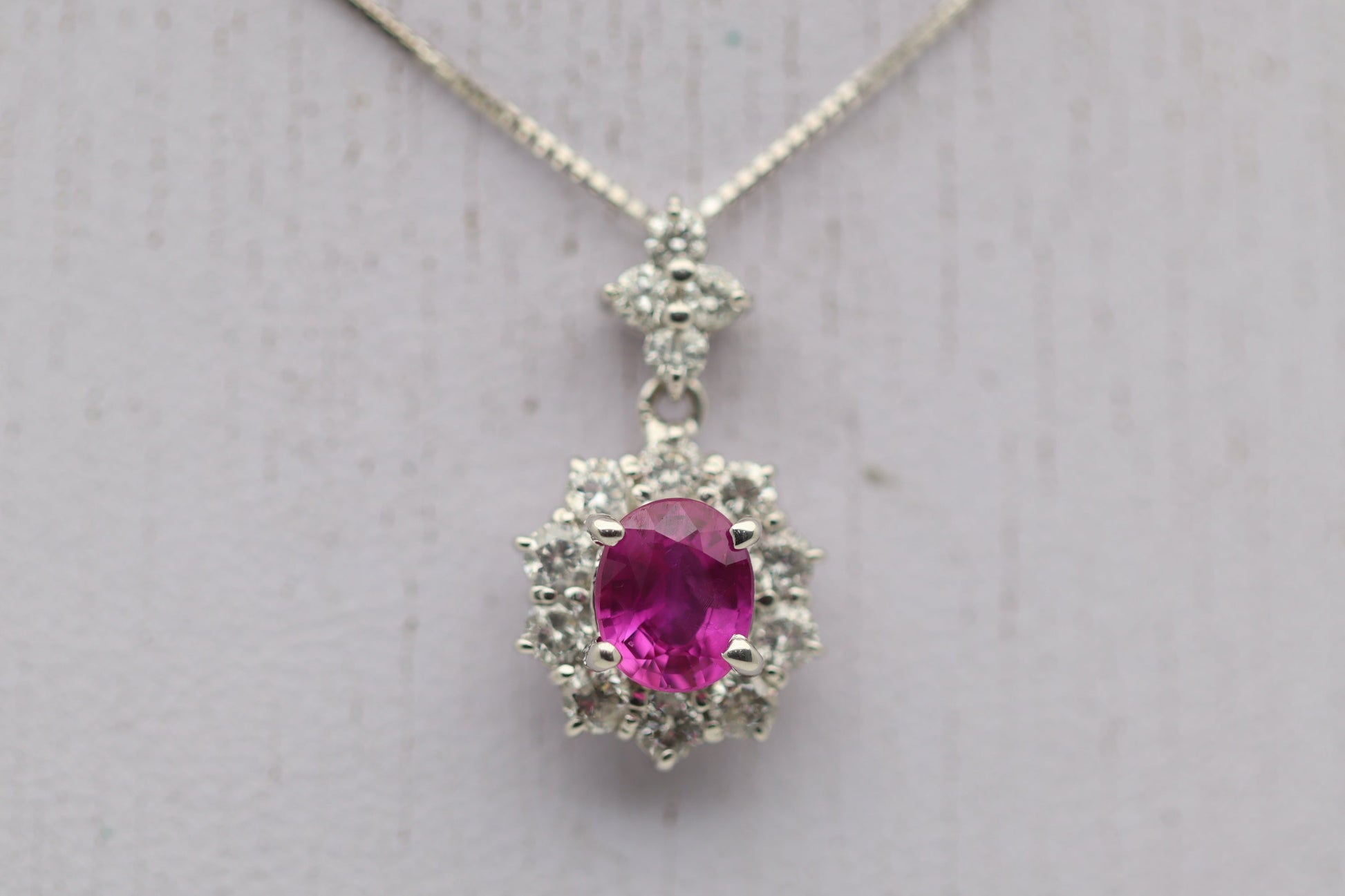 A lovely intense reddish-pink sapphire takes center stage! The color is so strong and vivid that some will consider this stone as a ruby. It weighs 1.09 carats and is oval shaped. Surrounding the sapphire is a halo of round brilliant-cut diamonds as well as additional diamonds on the bail above it, which weigh a total of 0.72 carats. Made in 18k white gold and ready to be worn!