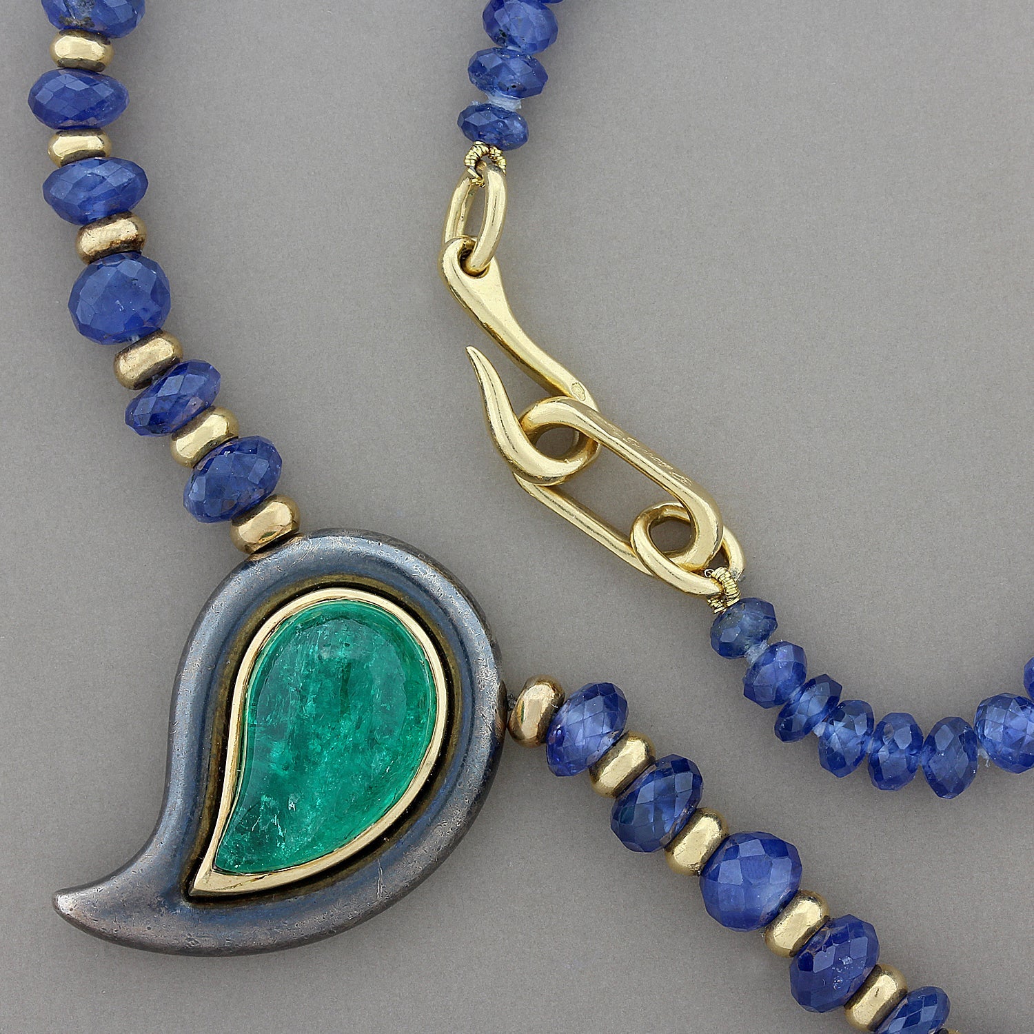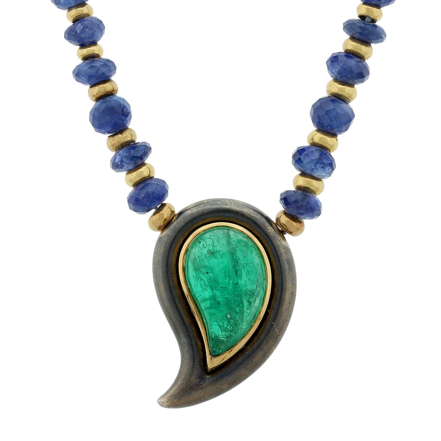 A wonderfully unique necklace by the French jewelry makers Poiray. It features a superb gem cabochon emerald with fine vivid green color. Gem quality faceted sapphire beads run along the entire necklace strand with gold accents. Made in 18K yellow gold, this is a one of a kind piece from the famed Poiray house.