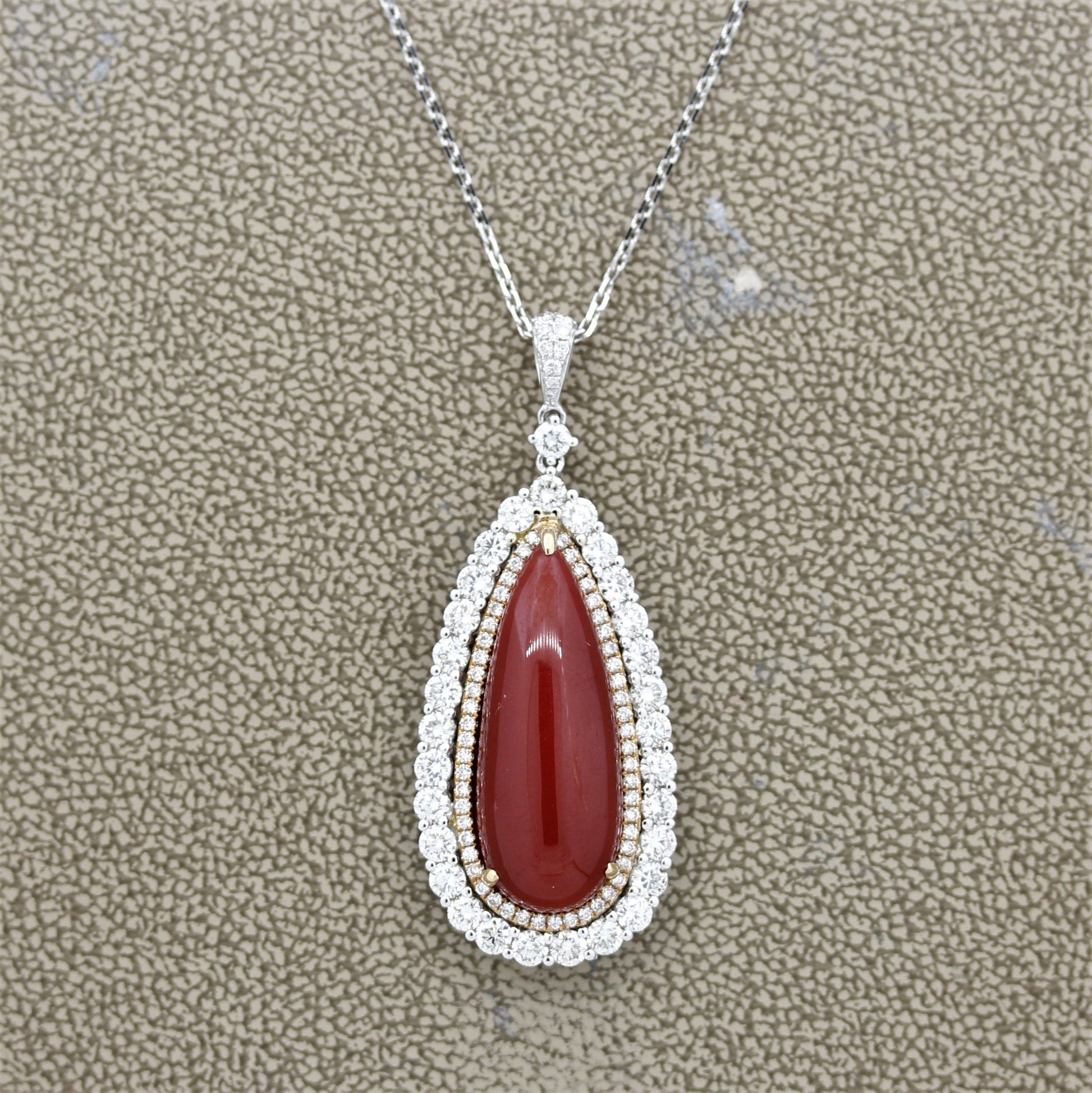 An extra fine piece of natural red coral polished as a smooth drop shape. It weighs 14.70 carats and most likely from the Mediterranean due to its amazing red color. Accented and haloing the coral are 2.29 carats of round brilliant cut diamonds. The inner halo is set with smaller diamonds in rose gold while the outer halo is set with large diamonds in white gold. Made in 18k gold and ready to be enjoyed.