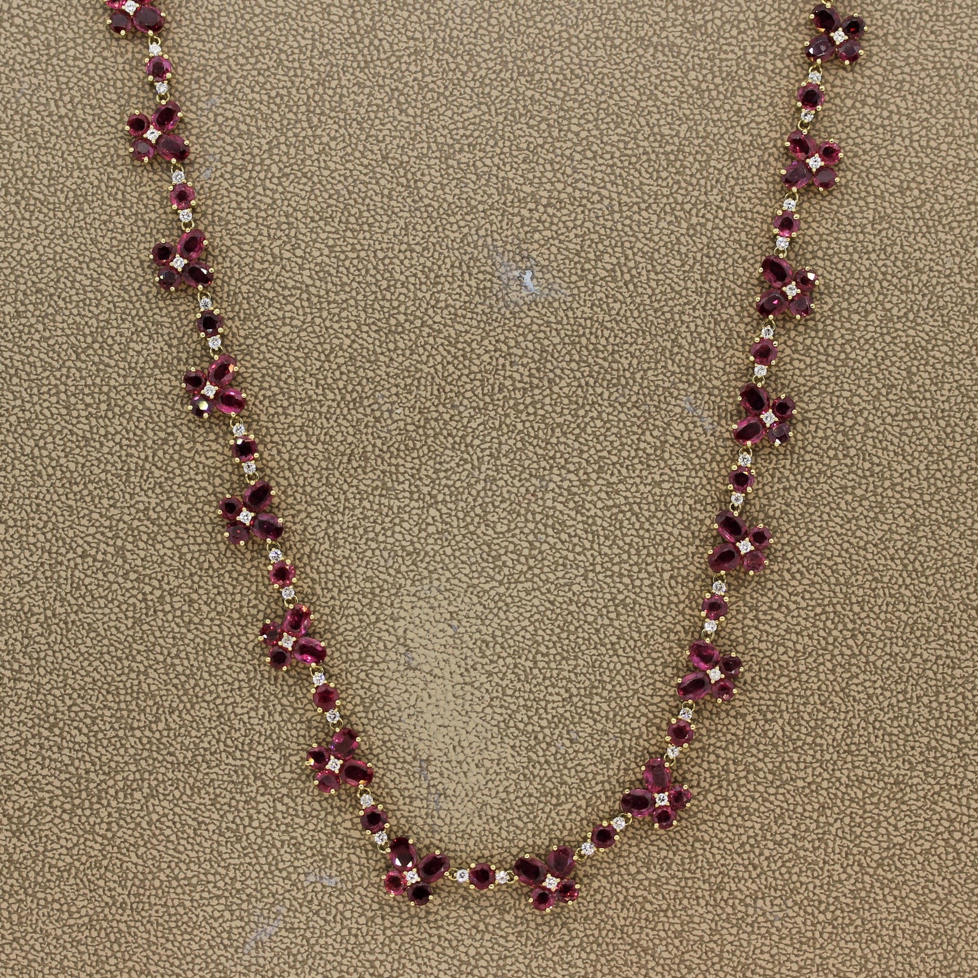 A sweet and chic ruby and diamond necklace. The piece features 44.89 carats of fine rubies in oval and round shapes along with 2.07 carats of round brilliant cut diamonds. They are set in a pattern of 2 oval and round shaped rubies each along with 1 diamond in the center creating motifs of butterflies or flowers, whichever you decide! They are set in 18k yellow gold in a light weight and flexible setting allowing the necklace to lay flat in position.