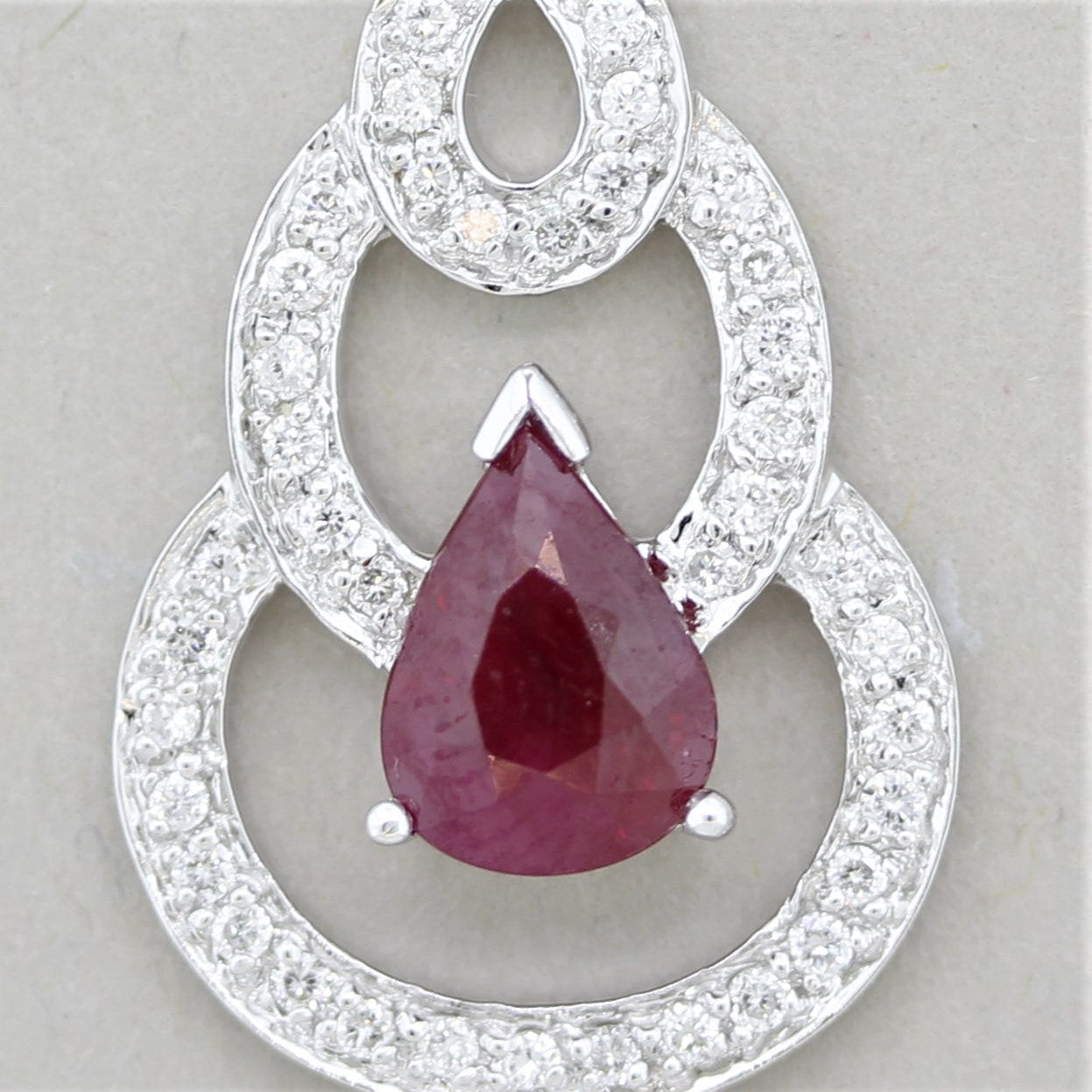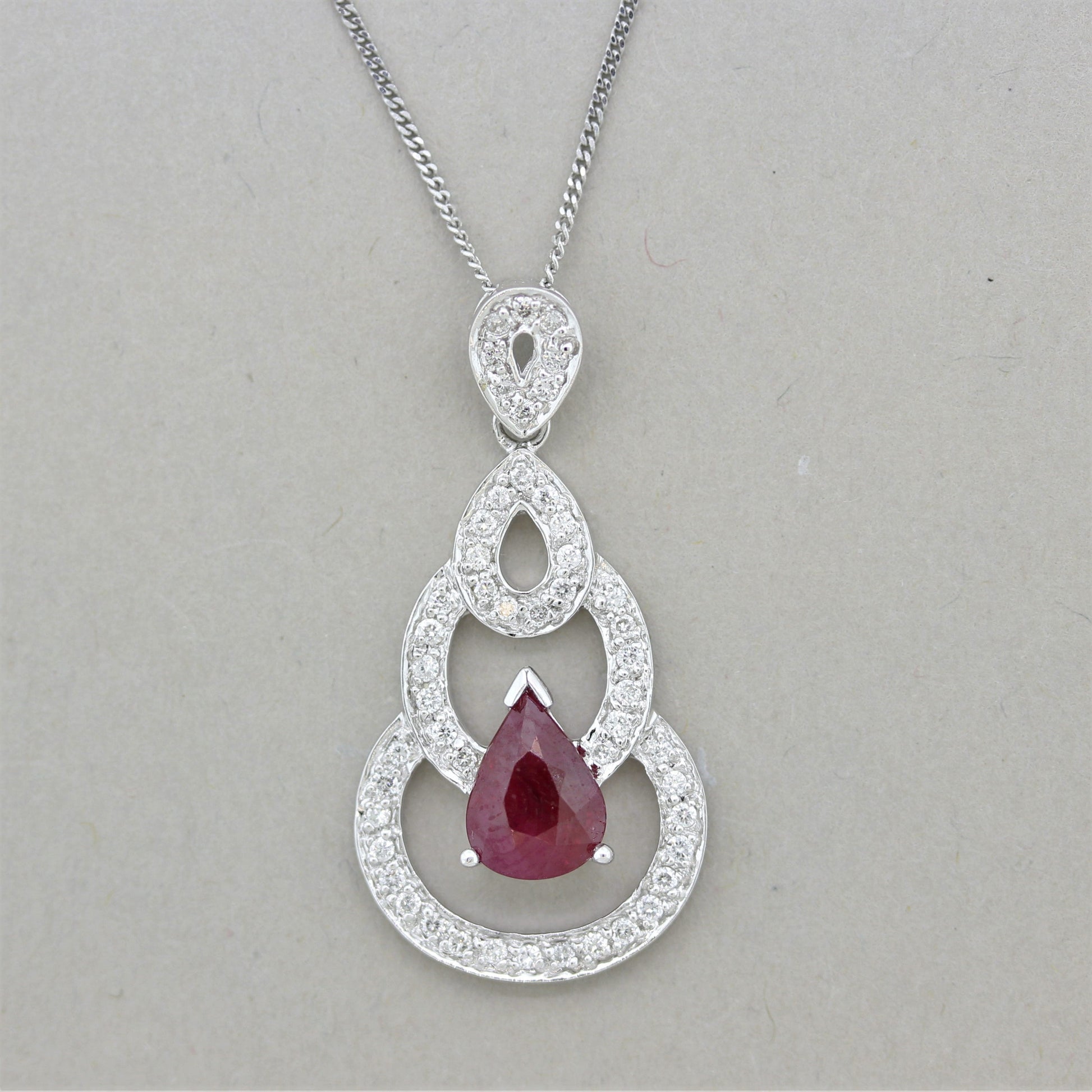 A fine pendant featuring a 1.18 carat pear-shape ruby! It has a rich vivid red color and is shaped beautifully in terms of the stones proportions and cut. It is accented by 0.29 carats of round brilliant-cut diamonds which add sparkle and brilliance to the piece. Made in 18k white gold.