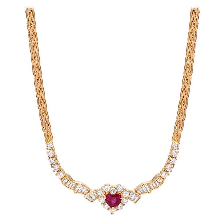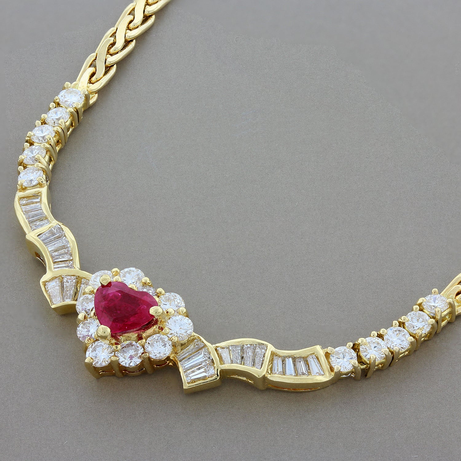 This beautifully designed necklace features a 0.91 carat heart shaped ruby accented by 2.37 carats of VS quality round and baguette cut diamonds. The 18K yellow gold setting has a quilted chain with a lobster claw clasp for a secure closure.