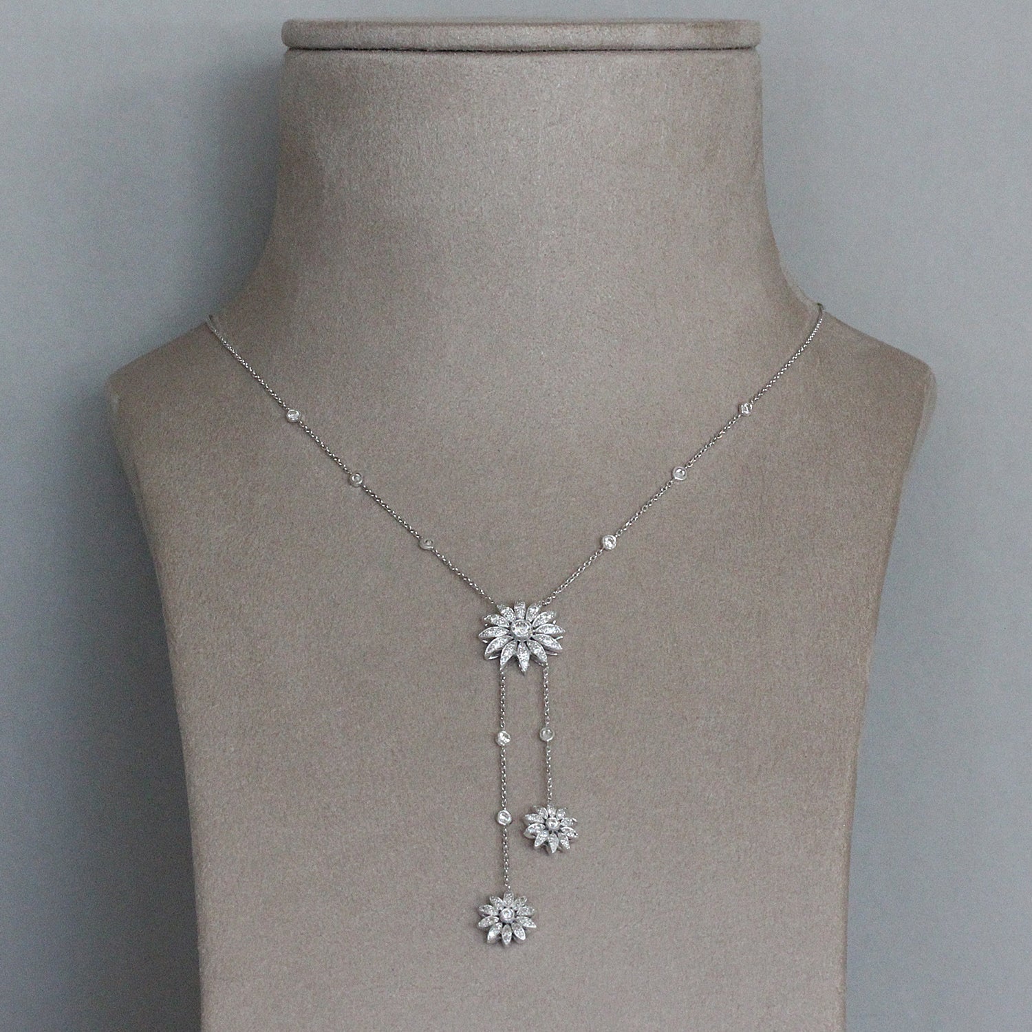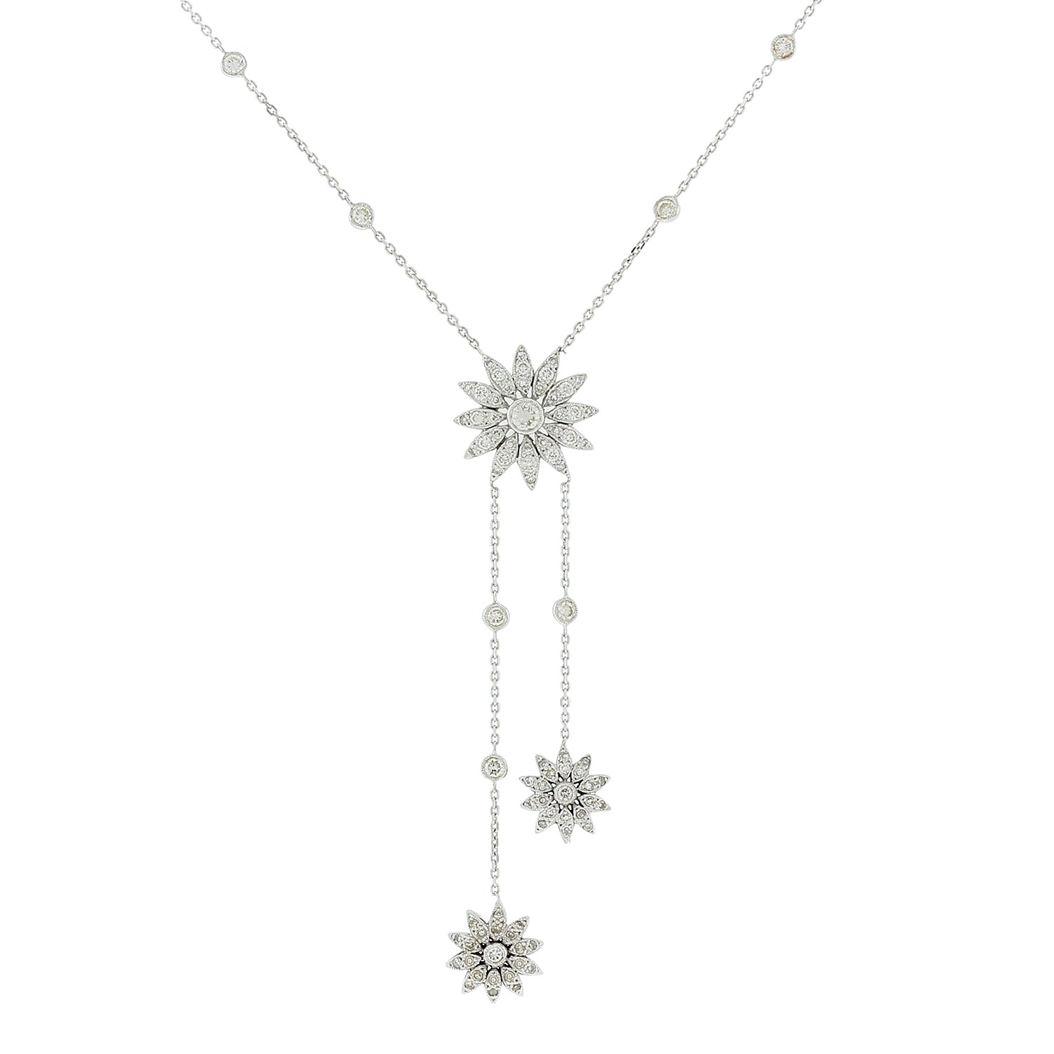 This ultra-feminine necklace features three sunflower drops. 1.16 carats of round cut diamonds are in the finely detailed sunflowers and in the diamond by the yard style chain for extra brilliance. Set in 18K white gold.