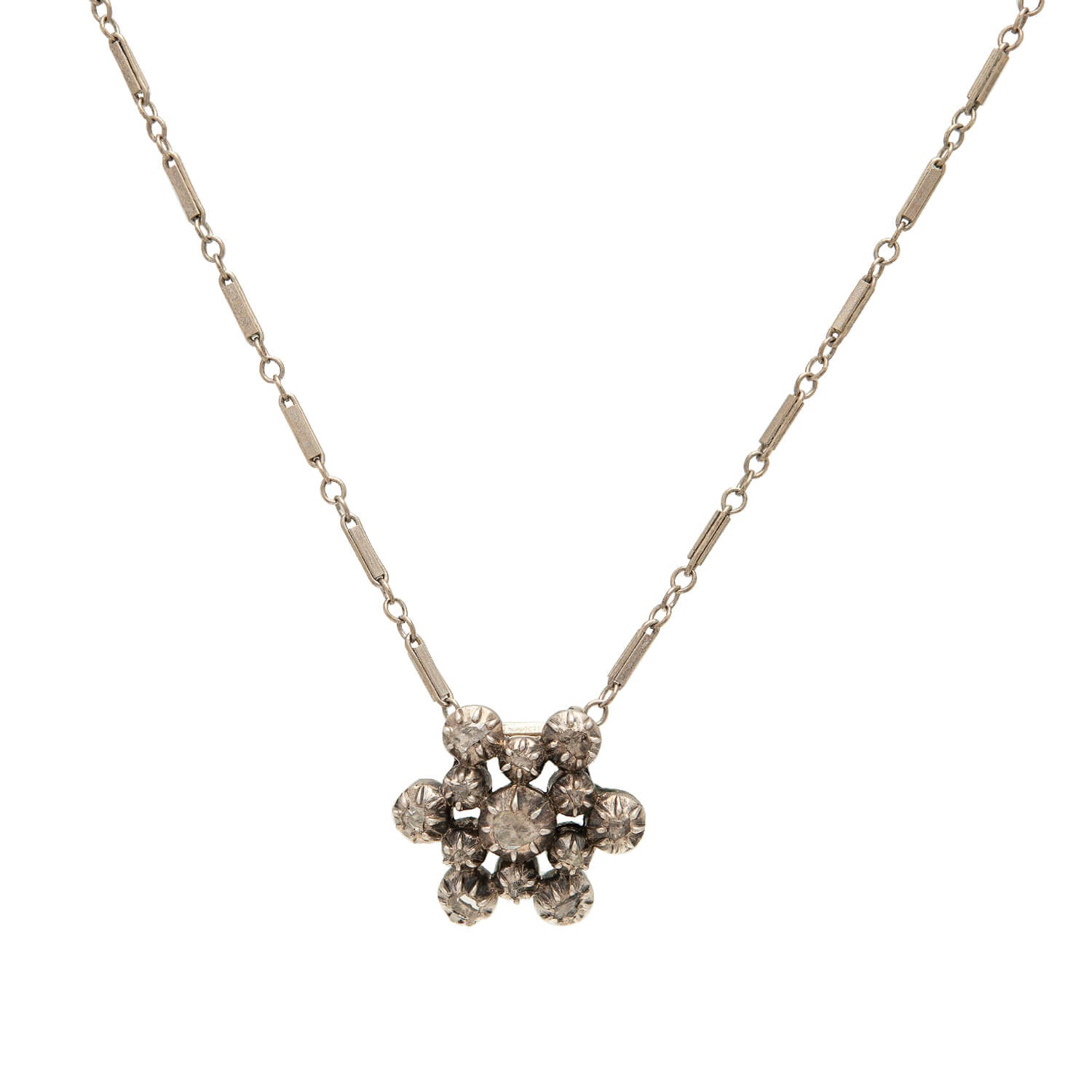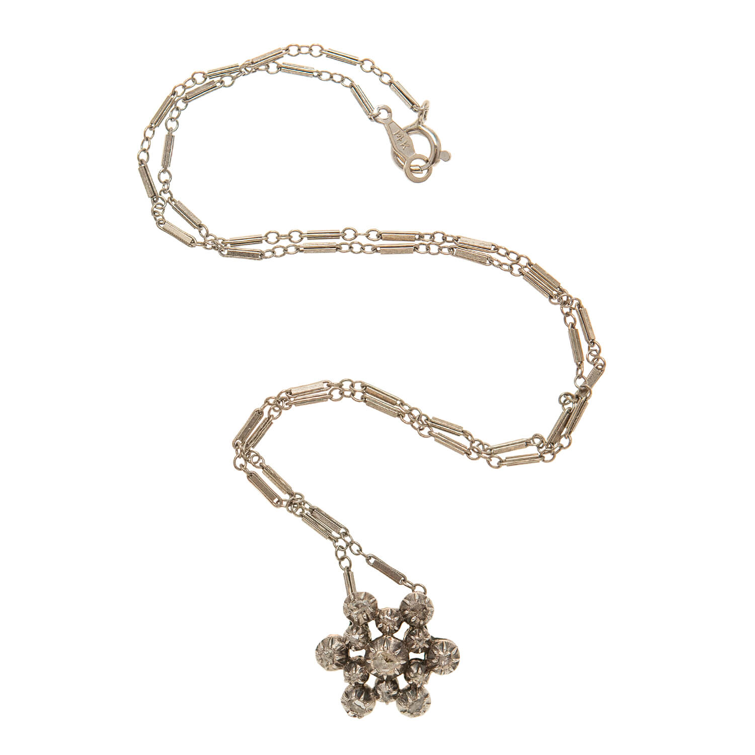 A gorgeous diamond?snowflake necklace from the Victorian (ca1880) era! This beautiful piece is comprised of?a sparkling 6-point?snowflake pendant that hangs from a delicate?antique?14k white gold chain with simple elongated links. The pendant, which is petite in size, is crafted in 14k yellow gold topped in sterling silver and detailed with?13 old Rose Cut diamonds.?All of the diamonds are?collet set, which is true to the era.?The pendant?has a hidden gold bail on the back and?hangs?from the antique white gold chain.?The chain comes together with a simple jump ring and is situated next to a panel marked with a gold purity mark, 14k.
