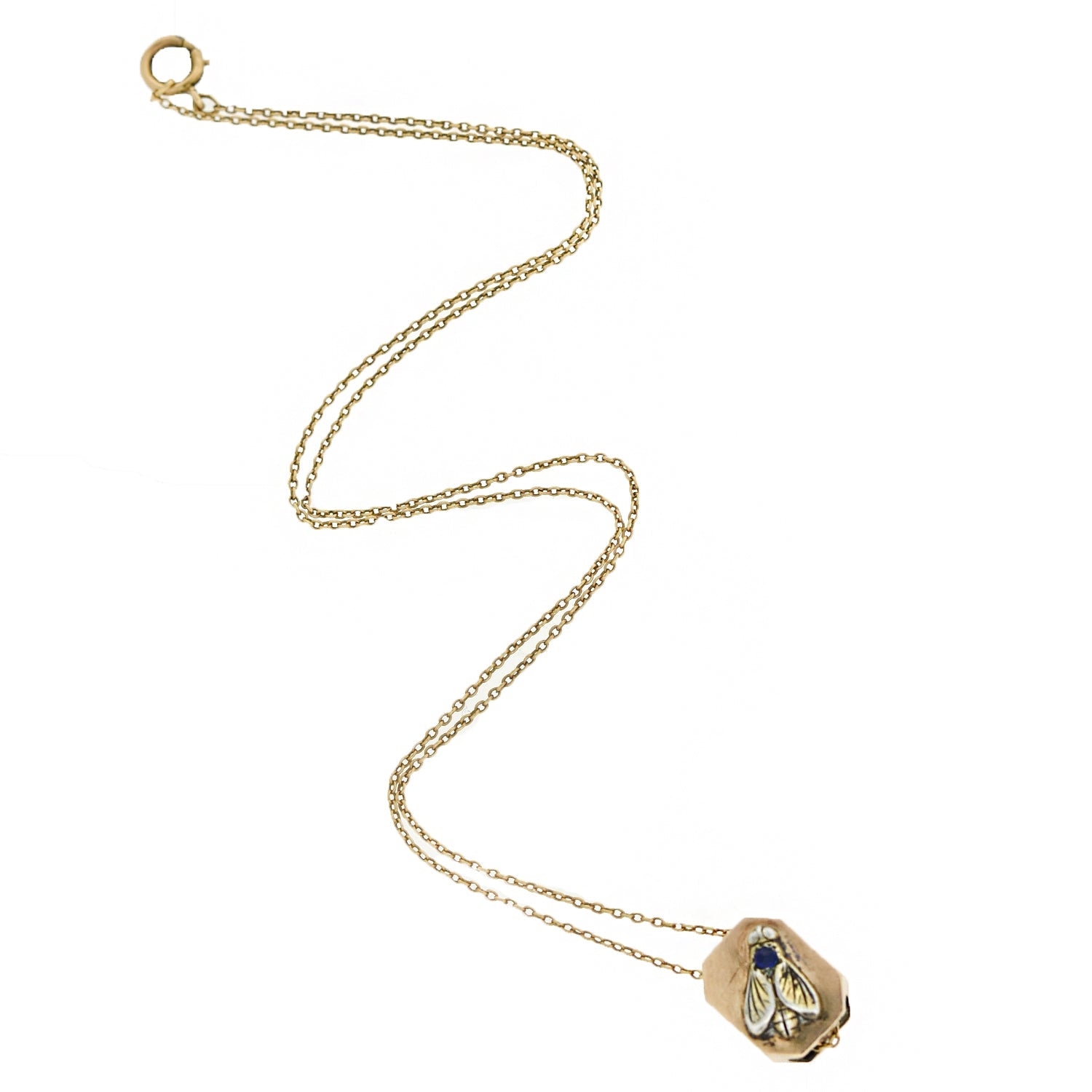 A gorgeous French Paste pendant?necklace from the Victorian?(ca1880) era! Crafted in?14kt rose gold with sterling silver accents, this?fantastic octagonal shaped slide?pendant hangs at the center of a simple chain. Resting atop the slide is a sterling silver fly featuring lovely realistic details, including carved veined wings, a?textured back, and two delicate beady eyes. Set within?the back of the insect's head is a vibrant blue French Paste accent stone, providing a wonderful pop of color to?the design. A?simple rose gold link chain is looped through the slide, allowing it to move freely up and down the necklace,?which?fastens in the back with a spring ring clasp.?This unique and?beautifully crafted pendant necklace would make a?special?addition to any collection! !