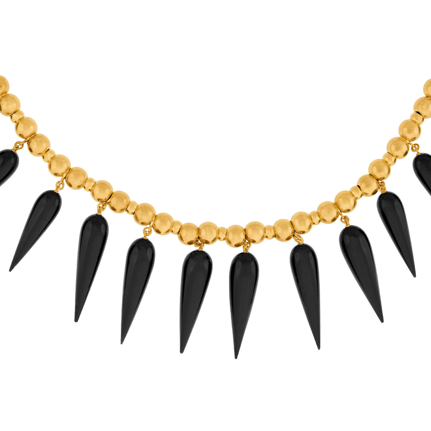 Condition: The overall condition of the necklace is excellent. There is no apparent damage to the round gold?beads?or onyx teardrops. The clasp is secure and in good working condition.?