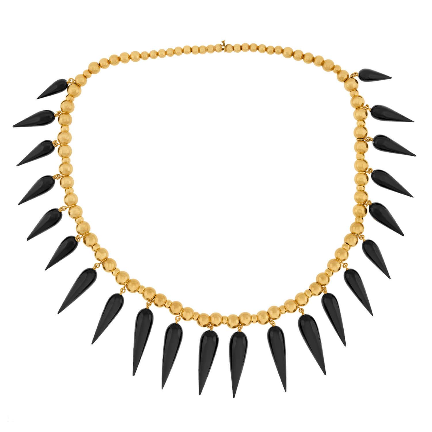 An absolutely stunning mourning?necklace from the Victorian (ca1880) era. Crafted in vibrant 18k yellow gold, the necklace is comprised of a single strand?of graduated gold beads which are strung on a gold chain. At the center of the necklace are 22 teardrop shaped onyx stones, each of which?hang from the chain with a small jump ring and are separated by three gold beads. The 22 onyx teardrops, which graduate in length, are shorter towards the ends and longer in the center. The necklace is completed at the end with a simple pissh clasp hidden within four small gold beads. It's a simply marvelous and striking necklace that would be great piece worn for a special occasion!