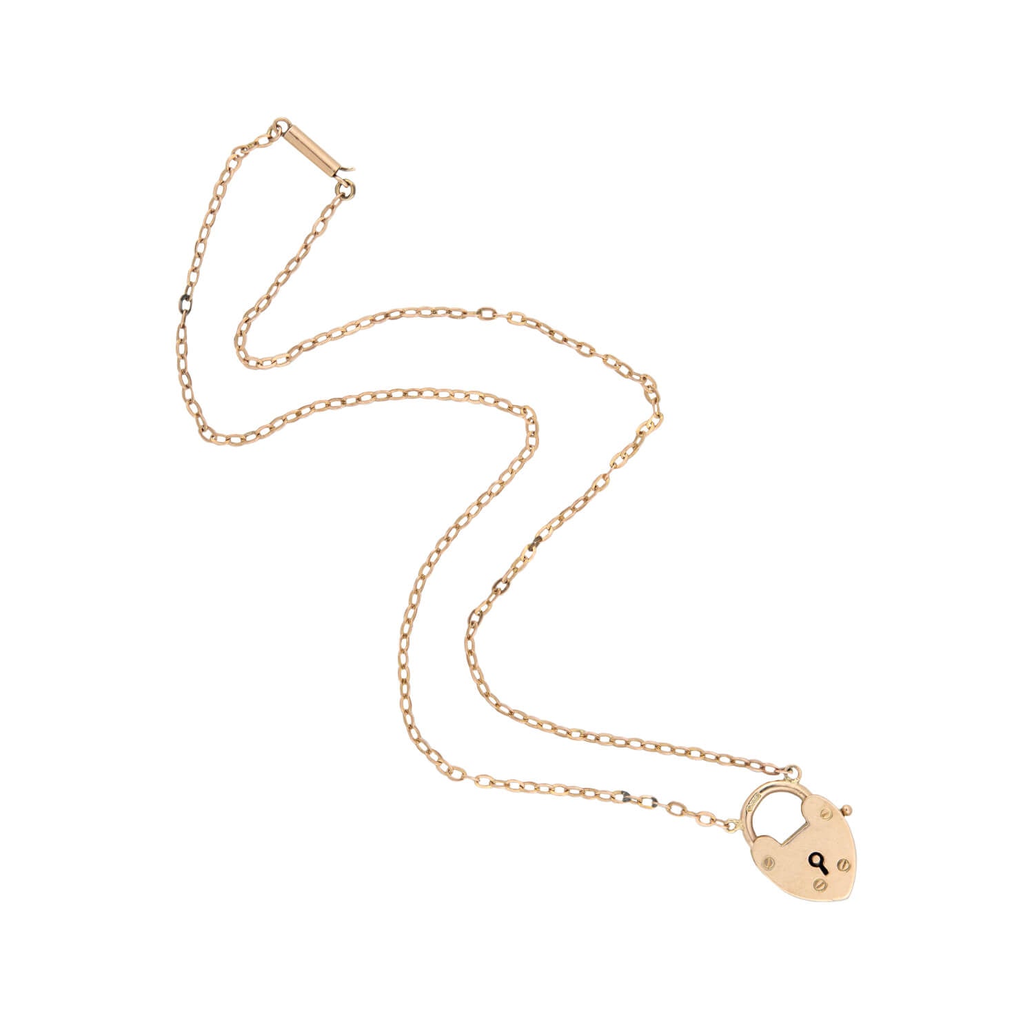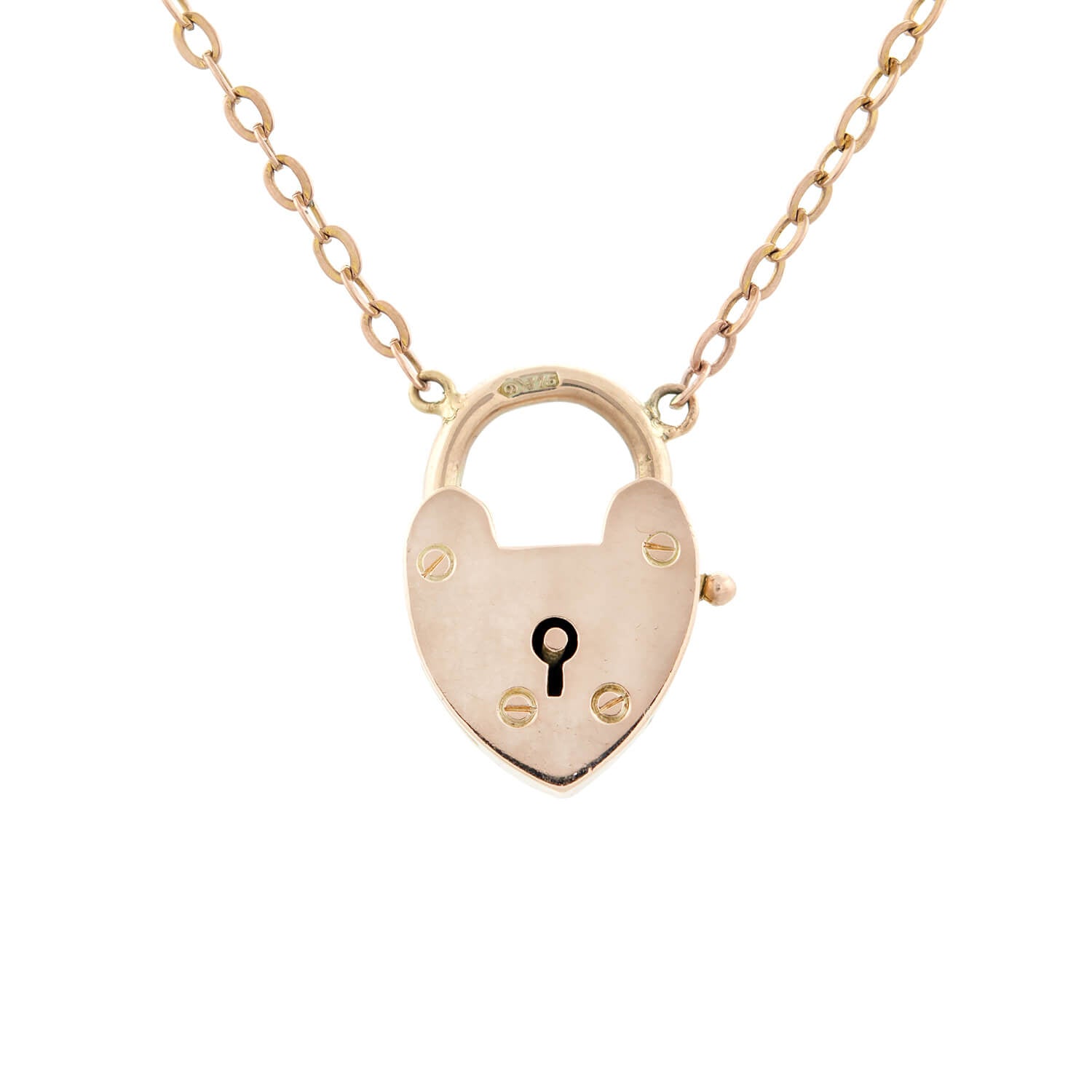 A stylish and romantic padlock?necklace from the Victorian (1867) era! Crafted in 9k rose?gold, this English-made piece?is a heart shaped lock attached to a simple chain necklace. The smooth surface of the pendant is studded with four screws and finished with a keyhole at the center.?The lock's shackle?can be pulled opened and snapped into place using a lever on the side. Attached at the top of the shackle?are?two small jump rings to which the chain is attached. Several English hallmarks and purity marks, including 9?and?375 on the shackle, the purity mark and a patent mark along the edge of the lock, and the same purity mark, the letter M, and the head of a leopard on the back, showing the lock was crafted in 1867 in London.?The lock was originally attached to a bracelet but was converted to a pendant and added to a Victorian era chain, which is secured at the back with a simple barrel catch.?A fabulous and stylish Victorian piece that blends seamlessly into modern day fashion, it would make a perfect addition to any collection!