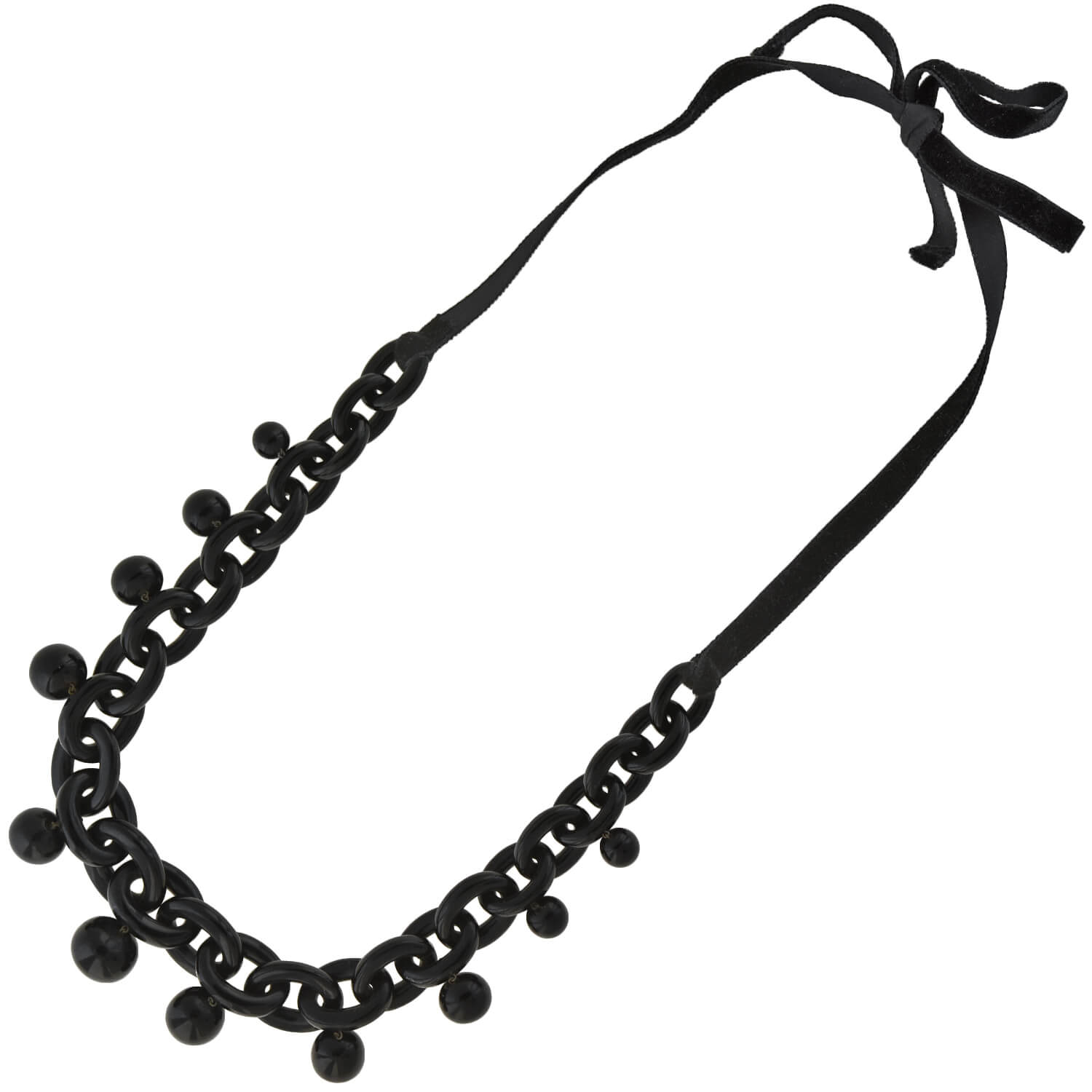 Measurements: The jet design measures approximately 16 long and hangs?approximately 1 1/2 long at the center where the largest ball?rests. The largest ball measures about 5/8 in diameter. The necklace has the ability to adjust to approximately 33.5 long,?leaving some room to tie a secure bow at the back.?