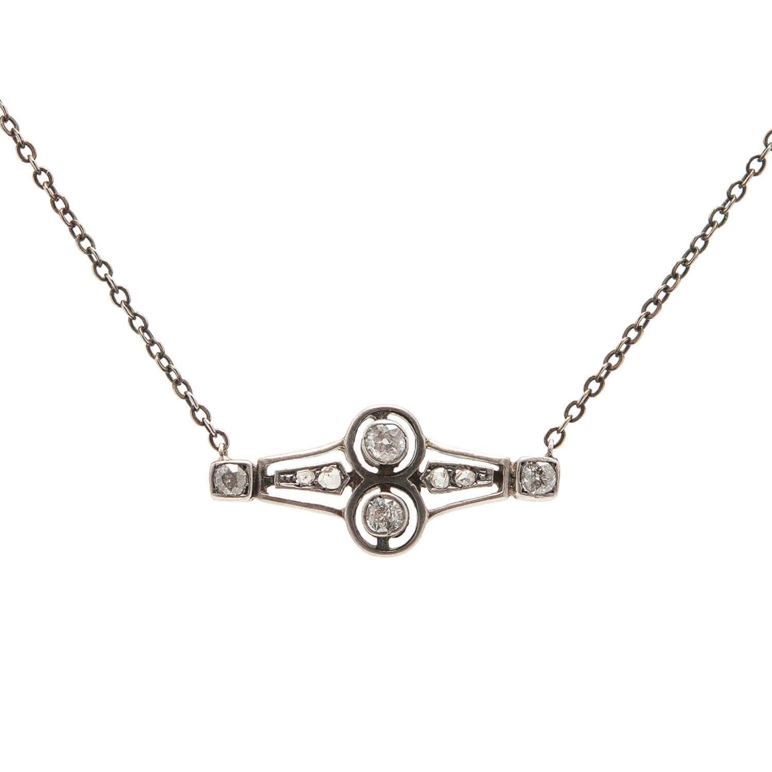 A gorgeous diamond conversion pendant necklace from the Victorian (ca1880) era! This beautiful piece is comprised of a sparkling oblong pendant made of sterling silver and set with .75ctw of rose and mine cut diamonds. The pendant features two mine cut diamonds in the center, four rose cut diamonds to the left and right of center, and finally two more mine cut stones at either end. All of the diamonds are bezel and bead set. The pendant attaches to the sterling chain via either end on two added loops. The pendant is stamped with the number 84 on one side, a Russian hallmark indicating silver purity of 87.5%. This gorgeous and simple pendant is so elegant and easy to stack!