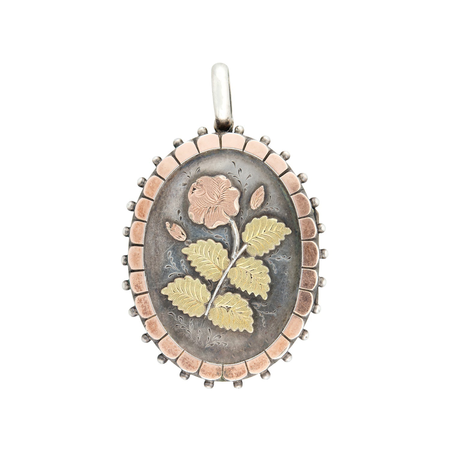 A beautiful mixed metals locket from the Victorian (ca1880) era!? The oval-shaped locket, which is particularly large in size, displays a blooming rose gold flower at the center, finished with large green gold leaves lining its stem. Engraved details provide texture to the design, and?a scalloped rose gold border surrounds the central image. Finishing the stunning design is a delicate beadwork pattern that lines the outer edge. The piece hangs from a fluted sterling bail at the top and when opened, the interior of the locket reveals two open spaces, perfect for storing special photographs inside. A?lovely example of Victorian artistry, this exceptional locket would make a special?keepsake?addition to any collection! ?