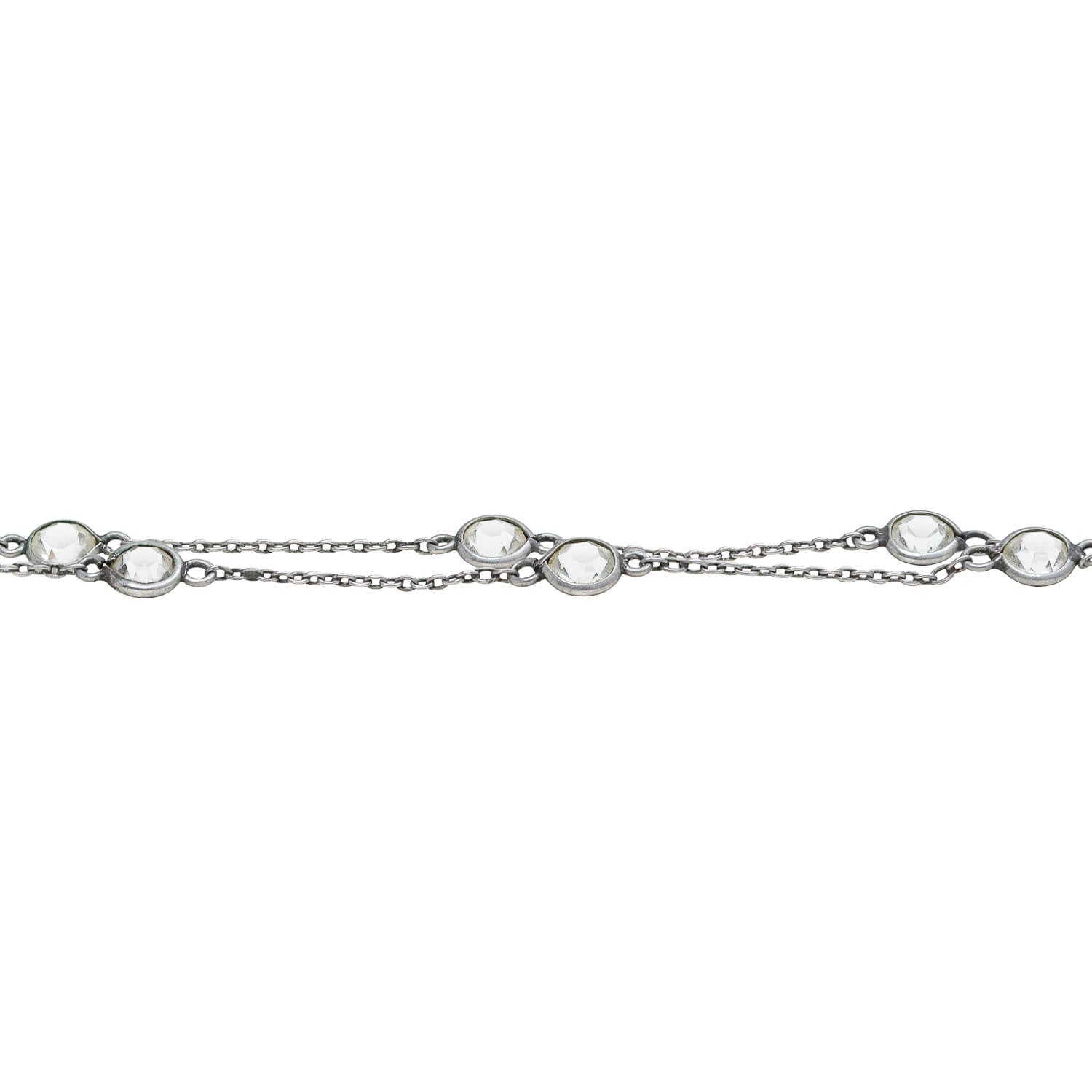 A gorgeous?French?paste?chain necklace from the Victorian(ca1880) era! Crafted in sterling silver, this long, flowing necklace is comprised of sparkling French paste stones, separated?by sections of delicate chain. The faceted stones are bezel set and rest in a smooth eyeglass setting, allowing the light to pass through and catch the facets beautifully with every turn.?This slip-on style chain can be worn long or easily doubled, providing the wearer with plenty of options.?Beautiful and eye-catching, this necklace would make a wonderful piece to wear everyday or for special occasions!